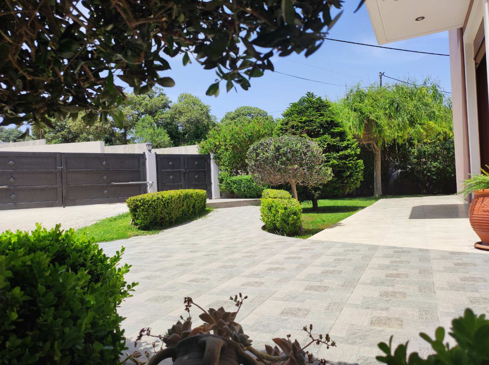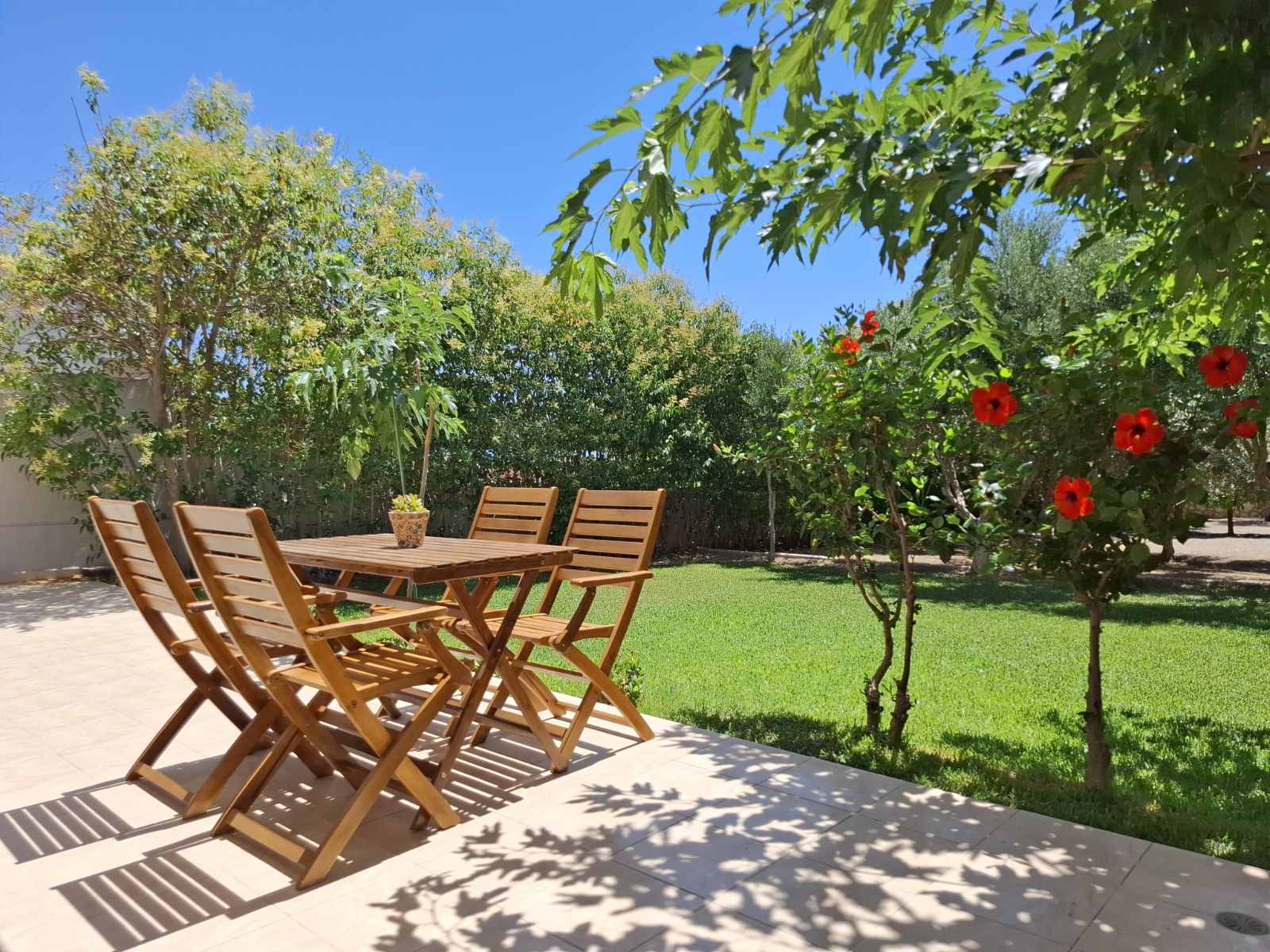 - Μεγάλη αυλή με τραπεζαρία, καρέκλες και ξαπλώστρες.