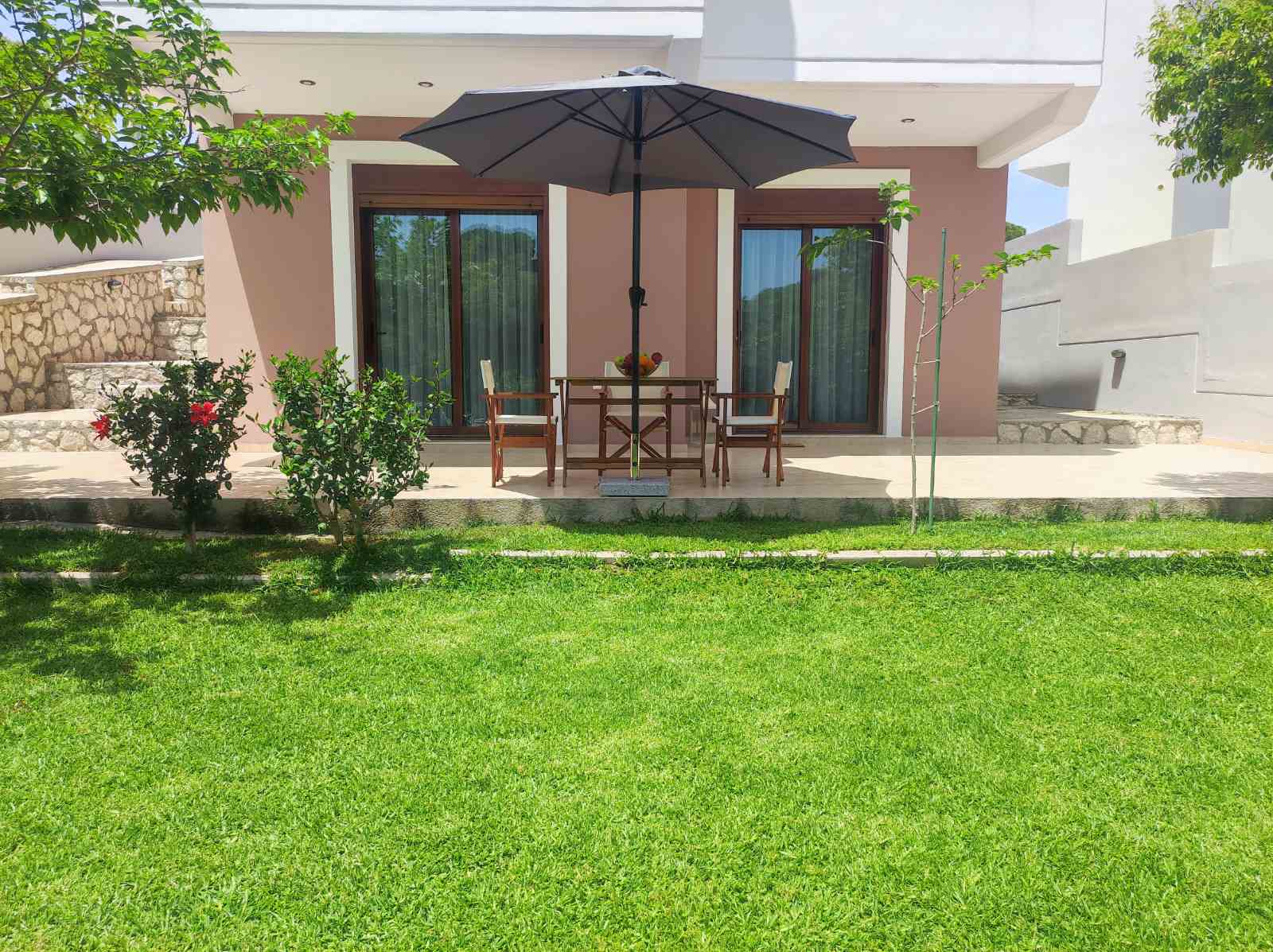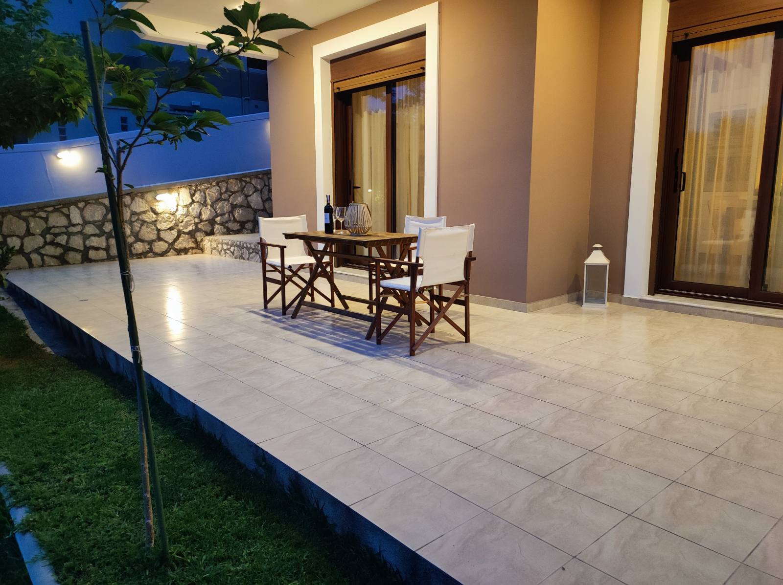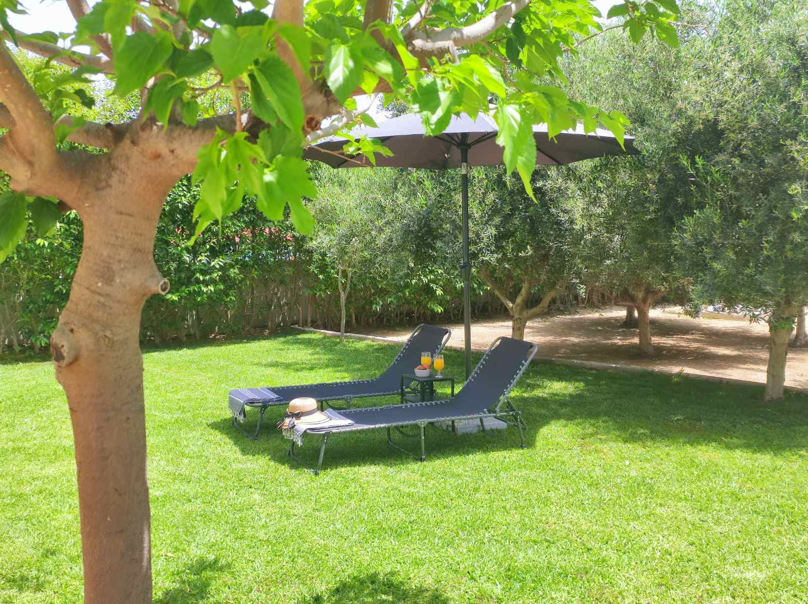- Μεγάλη αυλή με τραπεζαρία, καρέκλες και ξαπλώστρες.